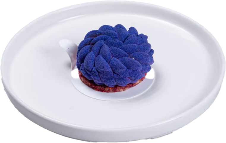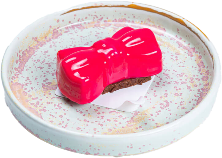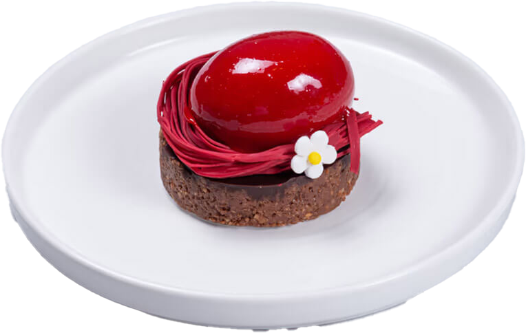 Mousse cream cheese and mascarpone, forest fruit insert, crispy layer of French biscuits and freeze-dried raspberries, velvet glaze made of white chocolate and cocoa butter.
