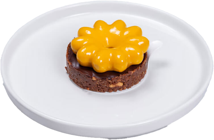 White chocolate mousse, vanilla crème brûlée, apricot pieces in the insert, crispy biscuit.