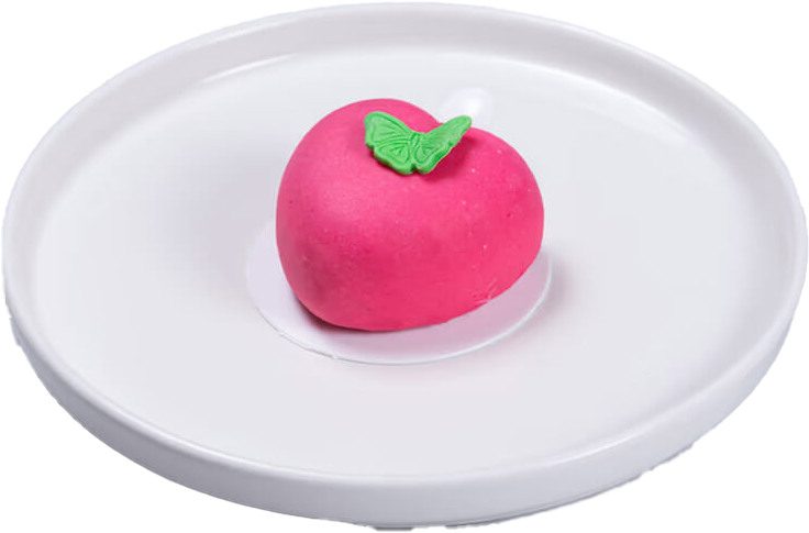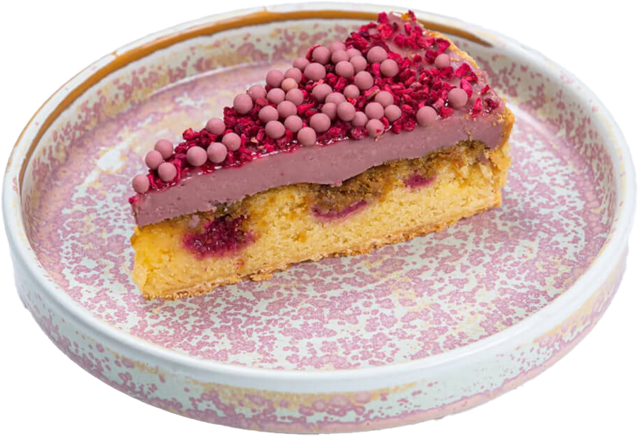 Plasma biscuit, roasted almonds, raspberry filling, crunchy ruby chocolate frosting.