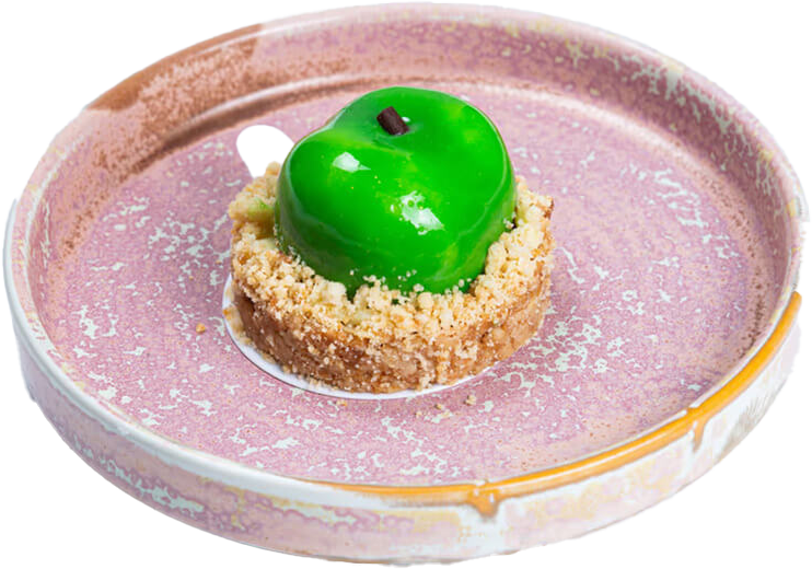 Base of biscuits and chopped pistachios, baked silky cream with mascarpone and Italian pistachio paste, white chocolate mousse and pistachios with raspberry sprinkles