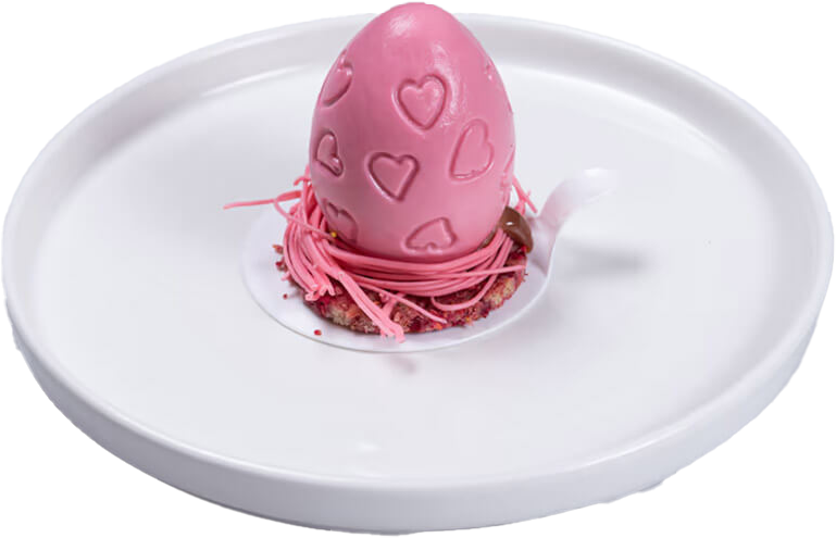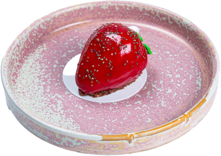 Strawberry mousse with Ruby chocolate, strawberry jam on a chocolate crust, creamy strawberry insert, crispy chocolate base, crispy Ruby chocolate glaze.
