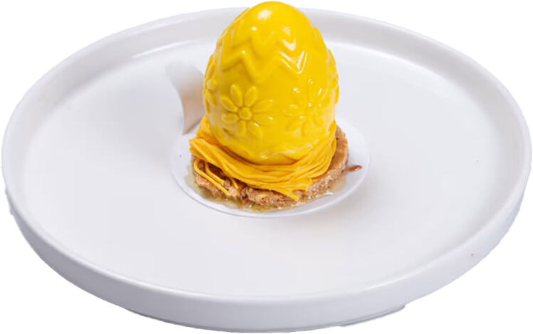 White chocolate mousse with lemon, lemon curd creamy insert, crispy biscuit with almonds and white chocolate.