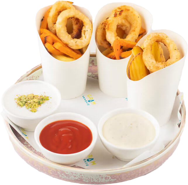 French fries mix, sweet potato fries, onion rings, mozzarella sticks, Greek yogurt dressing with Parmesan cheese,